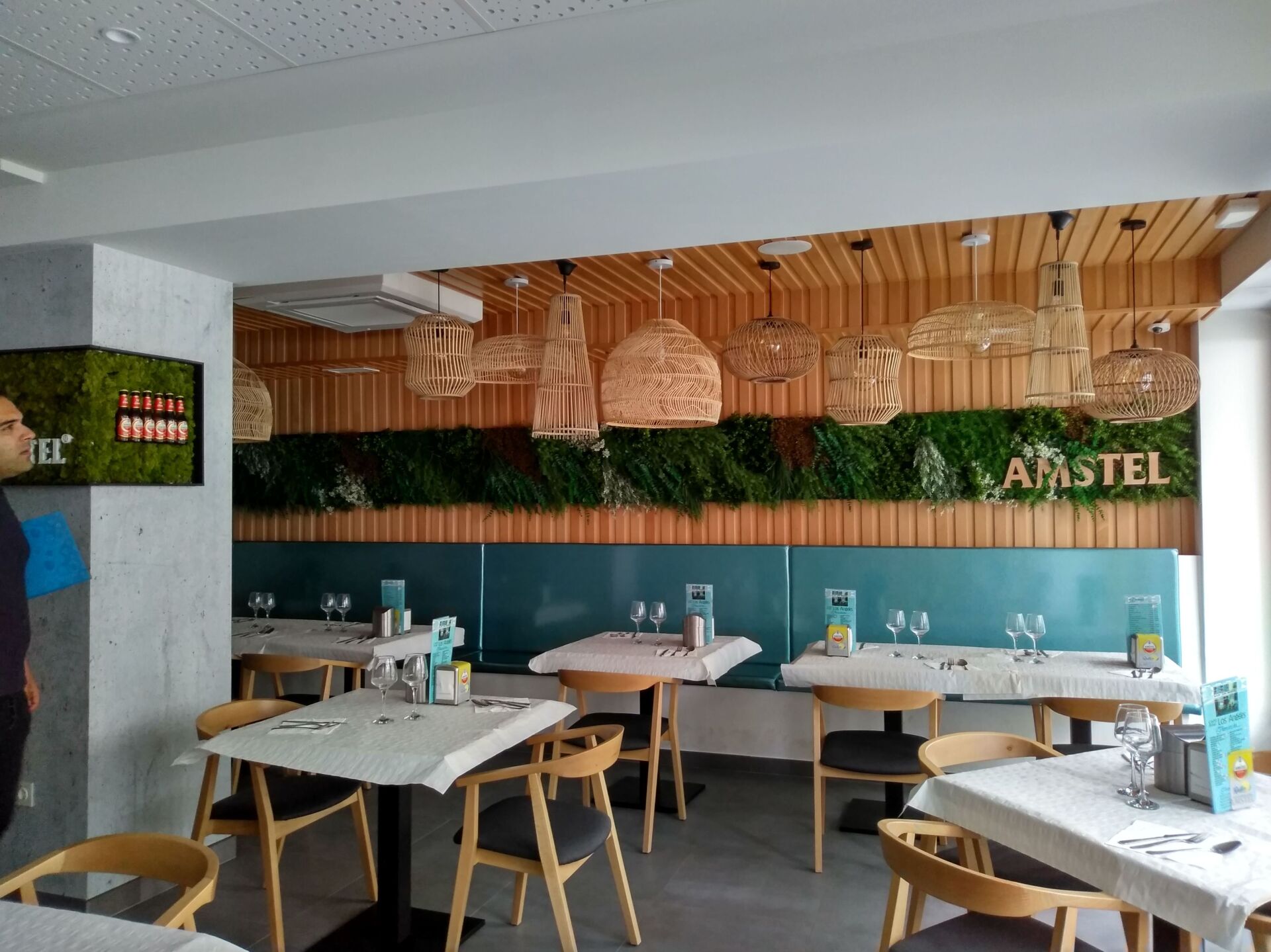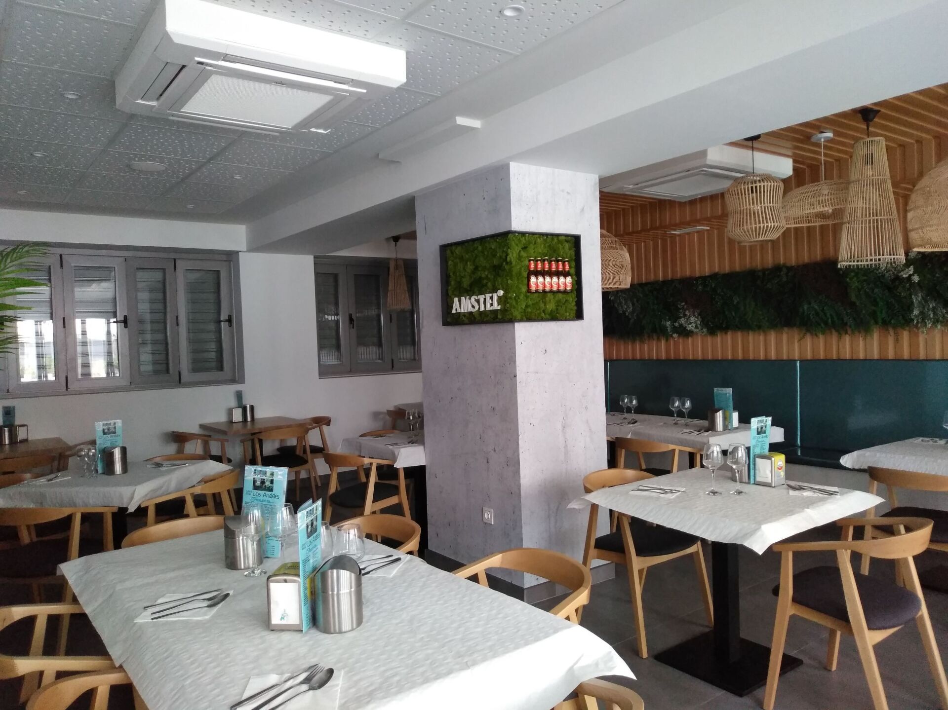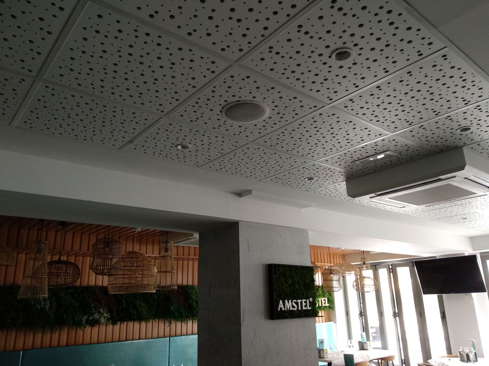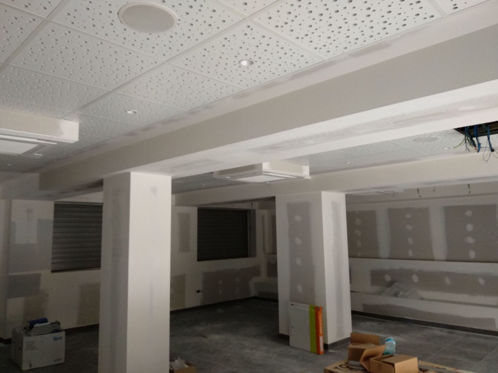 Acoustic Drywall ha llevado a cabo los trabajos de aislamiento acústico para adaptar el local a las exigencias normativas actuales, así como la distribución interior y falsos techos decorativos, combinando un falso techo desmontable fonoabsorbente con placa tipo Pladur Fon y zonas de falso techo liso, adaptando el diseño del techo a la complejidad de la estructura del local que dispone de una serie de vigas descolgadas que ha habido que salvar mediante techo continuo decorativo liso.