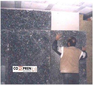 Aglomerado de poliuretano, es utilizado como absorbente-amortiguador, en conjunto con materiales puestos sobre el otorgaría un aislamiento altísimo a ruido aéreo. Fácil de instalar barato respecto a materiales con el mismo rendimiento, baja mano de obra.